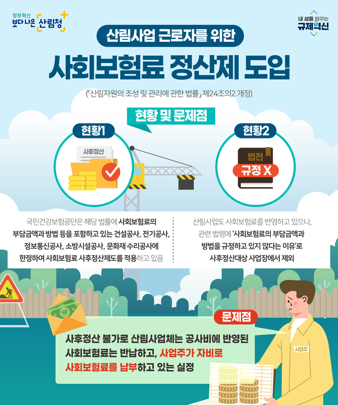 산림청(청장 박종호)은 정부혁신 및 규제개혁의 일환으로 산림사업 분야도 건설 분야와 같이 사회보험료 정산대상 사업장에 포함될 수 있는 내용을 담은 산림자원의 조성 및 관리에 관한 법률 개정안을 26일 공포했다.