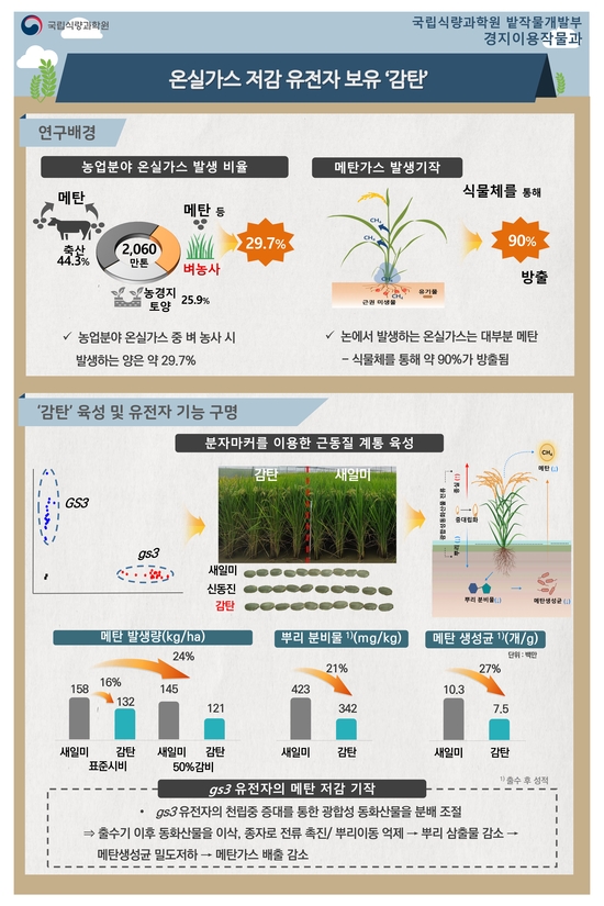 이에 농촌진흥청은 메탄 발생을 줄이면서도 품질과 생산성은 갖춘 저탄소 벼 품종 ‘감탄’을 개발해 기후 위기 대응 및 농업 탄소 감축에 노력하고 있다.