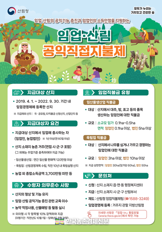 올해 지급 대상 19,658건으로 산림면적은 6만 7천 헥타르(ha)이다. 이중 임산물생산업은 17,703건(391억 원), 육림업은 1,383건(69억 원), 임산물·육림업 겸업은 572건(56억 원)으로 총 516억 원을 지급한다.