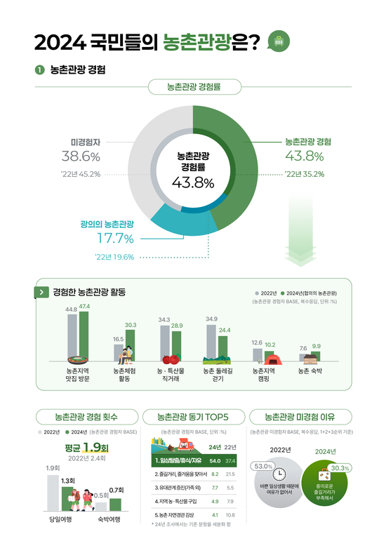 2024년 한 해 동안 농촌관광을 경험한 국민은 모두 43.8%로 지난 조사(2022년 35.2%)보다 늘었다. 관광객들이 농촌을 찾는 주요 이유는 ‘일상탈출/휴식/치유(54.0%)’, ‘즐길거리, 즐거움을 찾아서(8.2%)’였다.