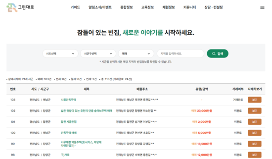 농림수산식품교육문화정보원(원장 윤동진)은 귀농귀촌 통합플랫폼 '그린대로' 내 '농촌 빈집은행' 서비스가 본격화됨에 따라, 12월 22일 기준 총 113건의 빈집 매물이 등록되고 24건의 거래가 성사되는 등 가시적인 성과를 보이고 있다고 밝혔다.