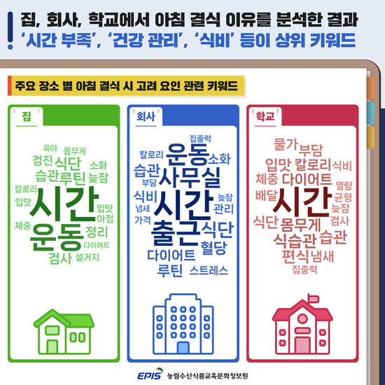 특히 이번 보고서는 ‘집, 회사, 학교’라는 생활 공간별로 결식 맥락이 다르다는 점을 밝혀냈다. ‘집’의 경우 ‘정리’, ‘설거지’, ‘육아’ 등 가사 노동과 가족 돌봄 요인이 아침 결식에 직접적인 영향을 미치는 것으로 분석됐다.