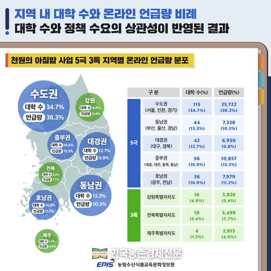 농림수산식품교육문화정보원(원장 윤동진, 이하 농정원)이 ‘천원의 아침밥 확대’를 주제로 온라인 언급량과 주요 키워드 분석 결과를 담은 ‘FATI(Farm Trend&Issue)’ 보고서를 발표했다.