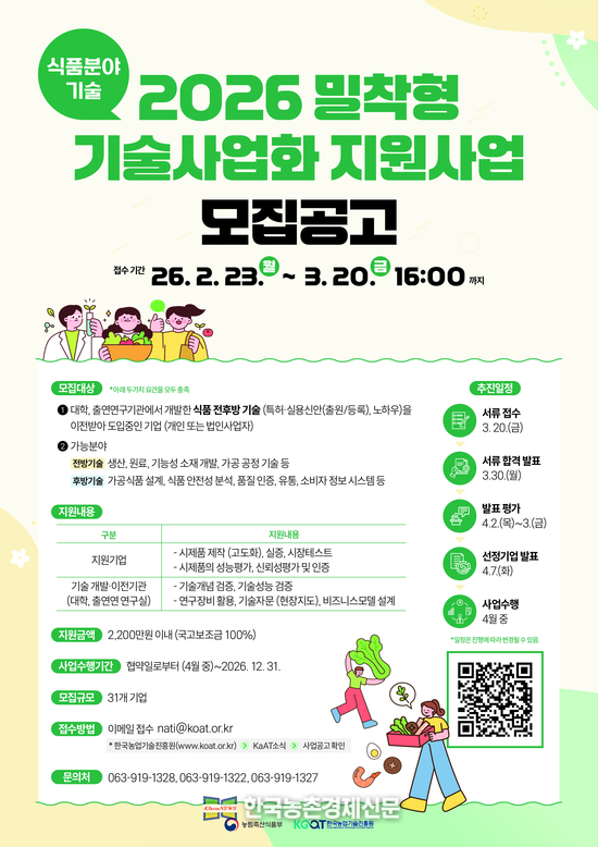 한국농업기술진흥원(원장 안호근)은 2월 23일부터 3월 20일까지 대학 및 연구 기관의 식품 관련 기술을 이전받은 기업을 대상으로 2026년 ‘밀착형 기술사업화 지원사업’ 참여기업을 모집한다.