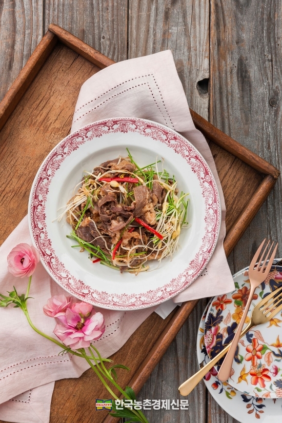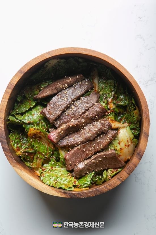 손질한 봄동을 양념장에 가볍게 버무린 뒤, 노릇하게 구운 한우 치마살을 올리면 ‘한우 봄동 무침’이 완성된다. 봄동의 산뜻함과 한우 치마살의 고소한 육즙이 어우러져 입맛을 돋우는 봄철 별미로 손색이 없다.
