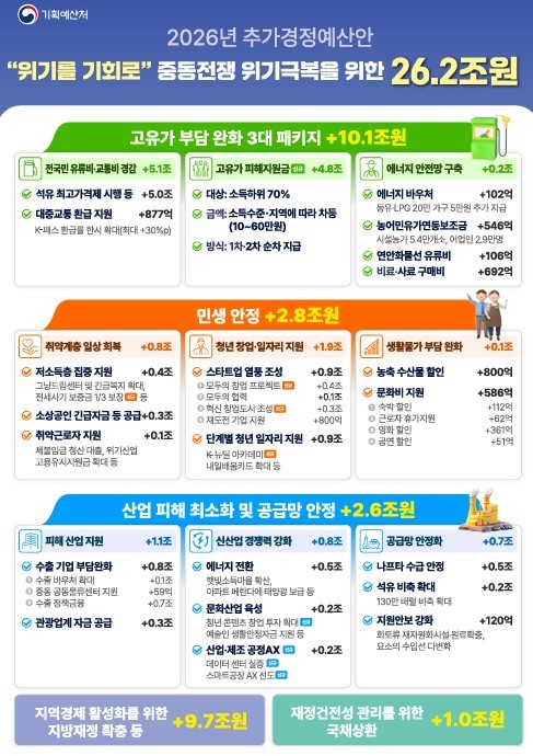 정부는 3월 31일(화) 국무회의에서 중동전쟁 위기 극복을 위한 2026년 추가경정예산(안)을 심의·의결하였다.
