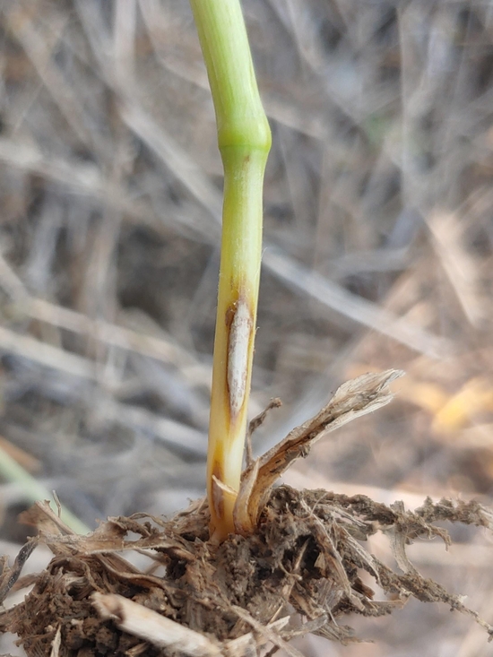 토양 전염 곰팡이인 병원체가 줄기 아랫부분을 통해 침입해 타원형의 갈색 병징을 만들고, 잎집을 따라 위로 퍼지기도 한다. 심해지면 줄기 하부가 부패해 이삭이 하얗게 마르거나 식물체가 쓰러진다. 줄기 아래쪽을 세심히 살펴 병징이 확인되면 즉시 등록 약제로 방제한다. 병 발생이 심한 재배지에서는 수확 후 잔재물을 수거한다.