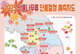 산림청(청장 김인호)은 우리나라 주요 산림의 단풍 절정 시기를 담은 ‘2025년 산림단풍 예측지도’를 1일 발표했다. 올해 단풍은 지역과 수종에 따라 다소 차이가 있으나 대체로 10월 하순부터 11월 초에 절정을 맞을 것으로 보이며, 수종별 평균 절정 시기는 단풍나무류(11월 1일,) 은행나무(10월 28일), 참나무류(10월 31일)로 나타났다. 특히 단풍나무류의 단풍 시기는 강원 설악산에서 10월 25일경 시작해 속리산(10월 27일), 가야산(11월 11일), 내장산(11월 6일) 순으로 절정에 이를 것으로 예측된다. 분석 결과에 따르면 단풍 절정 시기는 최근 10년 대비 약 4∼5.2일 늦어졌고, 수종별로는 단풍나무류 0.43일, 참나무류 0.52일, 은행나무가 0.50일씩 매년 늦어지는 것으로 나타났다. 이번 예측은 국립수목원과 전국 권역별 공립수목원 9개소, 국립산림과학원이 협력해 수집한 생물계절 장기 관측자료와 산악기상정보를 활용해 산출했다. 단풍 절정 기준은 각 수종의 단풍이 50% 이상 물들었을 때를 기준으로 했으며, 산림청은 앞으로도 관측지점을 확대해 예측 정확도를 높이고 기후변화 대응 연구와 국민 생활에 도움이 되는 정보를 지속적으로 제공