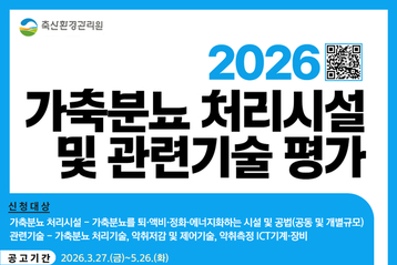 - 축산환경관리원, 3월 27일부터 5월 26일까지 ‘2026년 가축분뇨 처리시설 평가’ 공고 중