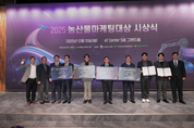 (사)농식품신유통연구원(이사장 원철희, 원장 김동환)은 12월 15일(월) aT센터 그랜드홀에서 ‘2025년 농산물마케팅대상 시상식’을 개최했다. 올해로 16회를 맞은 농산물마케팅대상 시상식은 농식품신유통연구원이 주최하고 농림축산식품부, 한국농수산식품유통공사(aT), 농협경제지주가 후원했으며, 전국 산지유통조직·법인·개인 등 30개 후보가 참여해 치열한 경합을 벌였다. 심사위원회의 서류심사, 본선심사, 현장실사를 거쳐 총 4개 조직이 선정되었다. 산지유통조직 부문 대상은 ‘강원감자농협조합공동사업법인(대표 김정권)’이, 최우수상은 ‘자인농협(조합장 손병한)’이 수상했다. 법인 부문 대상은 ‘일광영농조합법인(대표 이현송)’이, 정책 우수사례 부문 대상은 ‘중문농협(조합장 김성범)’이 각각 선정되었다. 대상 수상 조직에는 농림축산식품부 장관상과 상금이, 최우수상 조직에는 농협중앙회 회장상과 상금이 수여됐다. 차세대 산지유통 리더를 발굴하는 ‘산지유통 뉴스타상’에는 ‘이석형 ㈜잇웨이브 대표’가 한국농수산식품유통공사(aT) 사장상을, ‘박준연 대가농협 과장’이 농협경제지주 농업경제대표이사상을 각각 받았다. ‘2025년 농산물 마케팅 대상 심사위원회’를 이끈 김완배 서