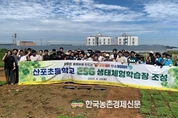 한국농어촌공사(사장 김인중)는 23일 지역 주민, 지역 소재 기관과 함께 나주시 산포면 산포초등학교에서 ‘이에스지(ESG) 생태체험학습장’을 조성을 위한 화이트 클로버 모종 이식 행사를 가졌다. 공사 사내벤처팀 ‘방초소년단’은 ‘화이트 클로버 초생재배 농법을 활용한 생태적 잡초방제 서비스’를 추진하고 있다. 화이트 클로버의 조밀한 토양 피복 효과를 활용해 저수지 제당, 태양광발전소, 학습장 등에 식재함으로써 잡초 발생을 억제하고 예초 비용을 줄이는 한편, 꿀벌 밀원 제공과 경관 조성 등 다양한 사회적 가치를 창출하고 있다. 이날 행사에는 공사 임직원과 나주시 지역 주민을 비롯해 ▲산포면 행정복지센터 ▲한국농수산식품유통공사 ▲농림식품기술기획평가원 ▲한국농촌경제연구원 ▲한국농업기술진흥원 ▲산포농협 ▲농협은행 한국농어촌공사지점 ▲신한은행 나주빛가람지점 등 110여 명이 참여해 화이트 클로버 모종 2,000판을 이식했다. 행사는 공사를 비롯한 참여 기관이 ‘광주 사회복지공동모금회’를 통해 모금한 금액으로 진행됐다. 공사는 앞으로도 사내벤처팀을 중심으로 잡초방제와 연계한 사회공헌을 이어갈 계획이다. 박형근 한국농어촌공사 방초소년단 팀장은 “이번에 마련한 생태체험장은
