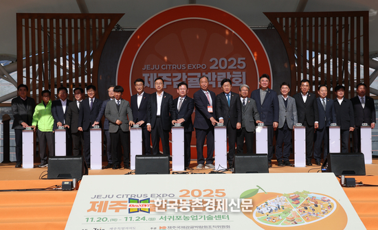 이승돈 농촌진흥청장은 20일 제주도 서귀포시농업기술센터 일원에서 열린 '2025 제주감귤박람회' 개막식에 참석해 축사를 하고 전시장을 관람하고 있다.<사진= 농촌진흥청 kenews.co.kr>