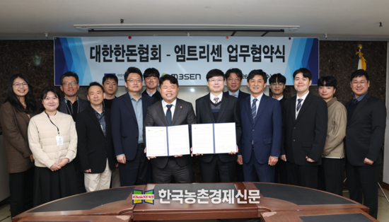 대한한돈협회(이기홍 회장)는 지난 4월 8일 제2축산회관에서 ㈜엠트리센과 인공지능(AI) 기술 기반 한돈산업 발전 및 농가 생산성 향상을 위한 업무협약을 체결했다.