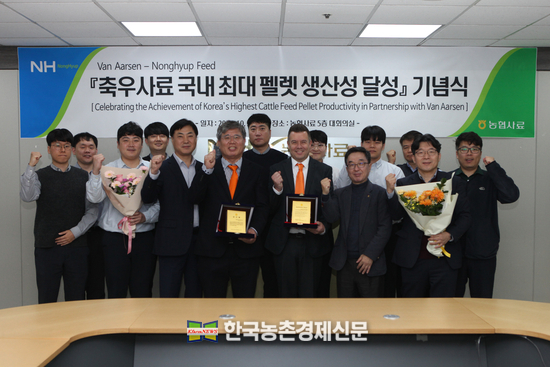 농협사료(대표이사 정종대)는 지난 10월 30일 본사에서 ‘농협사료 축우사료 국내 최대 펠렛 생산성 달성 기념식’을 개최하였다. 또한 이번 성과에 적극적인 기술 지원과 핵심설비를 제공한 유럽 관계자(Van Aarsen 社)를 초청하여 감사패를 증정하였다.