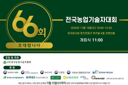 (사)전국농업기술자협회(회장 이영휘)는 11월 19일(수) 11시부터 한국마사회 렛츠런파크 럭키빌 6층 컨벤션홀에서 ‘제66회 전국농업기술자대회’를 개최한다.