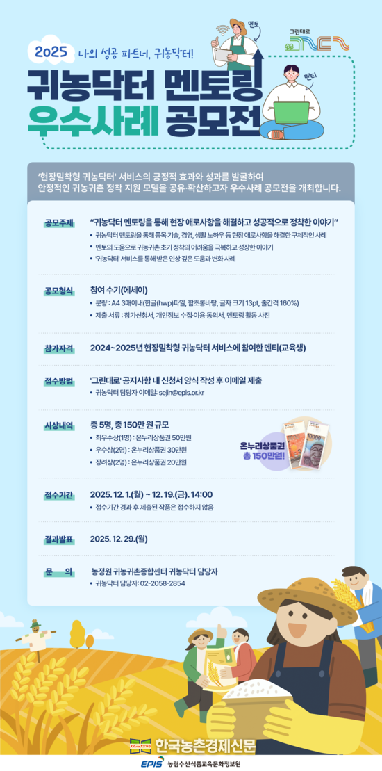 공모 주제는 ‘귀농닥터 멘토링을 통해 현장 애로사항을 해결하고 성공적으로 정착한 이야기’이며, 2024년부터 2025년까지 귀농닥터 서비스를 이용한 경험이 있는 멘티(교육생)라면 누구나 참여할 수 있다.