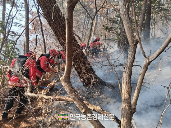 산림당국은 산불이 야간 산불로 이어짐에 따라 진화장비 108대, 진화인력 997명을 선제적으로 긴급 투입하여 밤새 산불확산 저지에 총력을 기울였으며, 일출과 동시에 산불진화헬기 25대를 순차적으로 투입하여 오전 10시 30분 주불진화를 완료했다.
