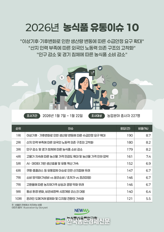 농식품 유통 분야 종사자들은 ‘기후변화로 인한 수급불안, 산지 인력 부족, 인구 감소 및 경기 침체에 따른 소비 감소 등’이 2026년에 가장 중요한 이슈가 될 것으로 전망, 발표했다.