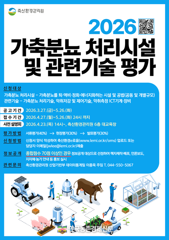 축산환경관리원(원장 문홍길)은 3월 27일부터 5월 26일까지 ‘2026년 가축분뇨 처리시설 및 관련기술 평가 계획’을 공고하고, 신청접수는 4월 27일부터 진행한다고 밝혔다.