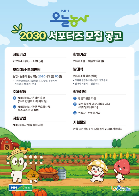 농협중앙회는 스마트 영농 플랫폼‘NH오늘농사’홍보와 청년층과의 소통 강화를 위해 ‘NH오늘농사 2030 서포터즈’를 모집한다고 밝혔다.